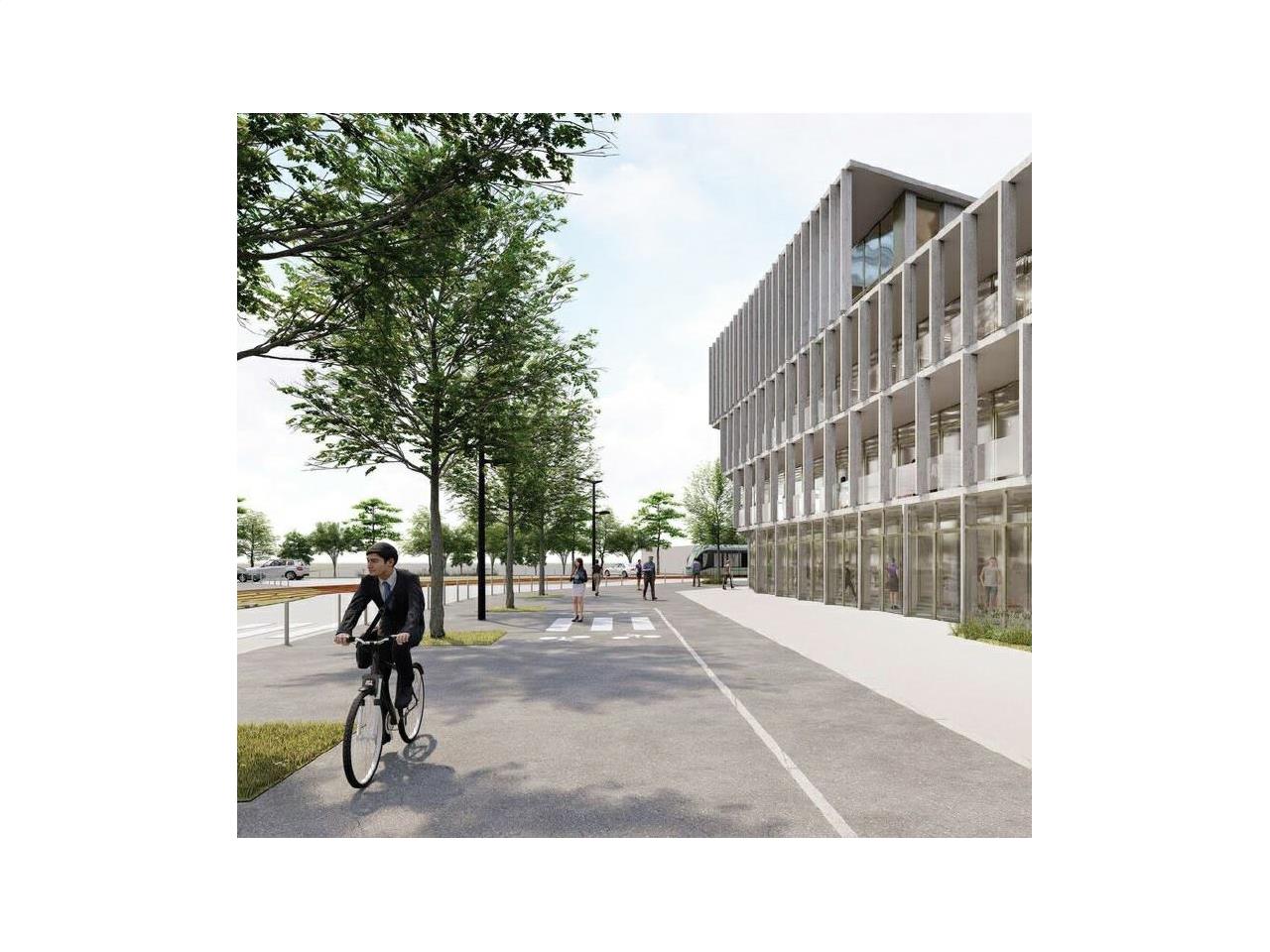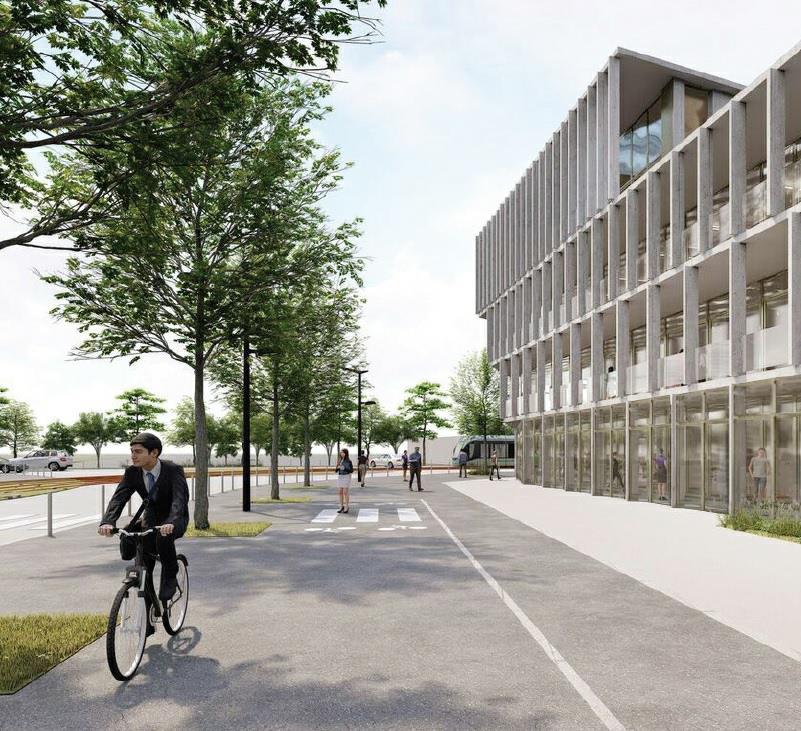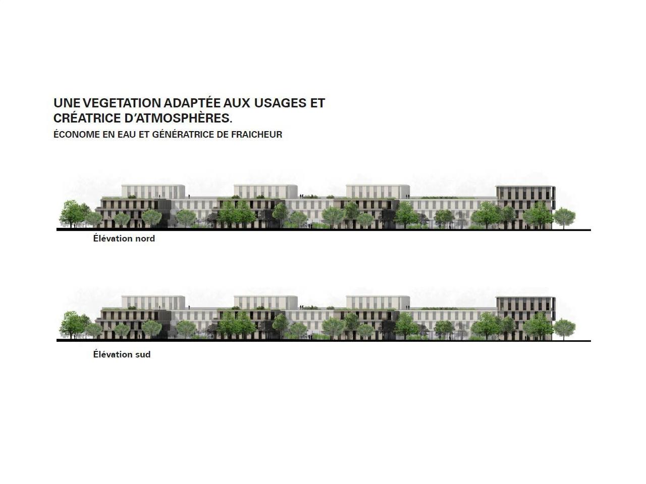 Pierre angulaire d’un milieu composé principalement de logements et d’équipements, le programme accueille des bureaux et un restaurant interentreprises. Le basculement est double : d’une part, entre une échelle tertiaire et des logements, dont un lotissement en mutation ; d’autre part, entre des structures privatives et un établissement ouvert au public. Pour limiter les effets du climat, maîtriser la dépense énergétique et garantir le plus grand confort thermique, un îlot de fraîcheur sera créé grâce à une conception architecturale et une approche paysagère orientées vers la recherche de l’ombre.