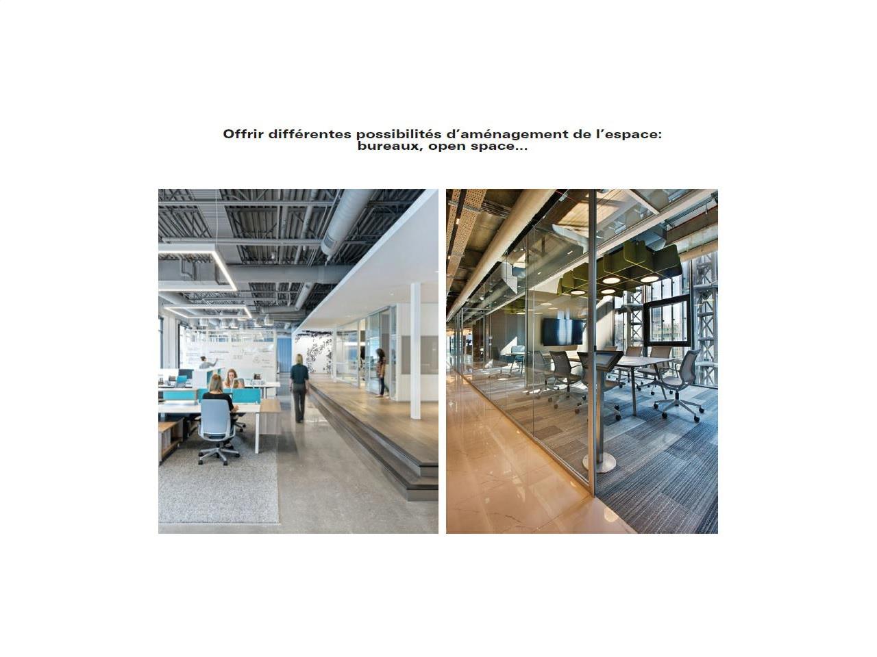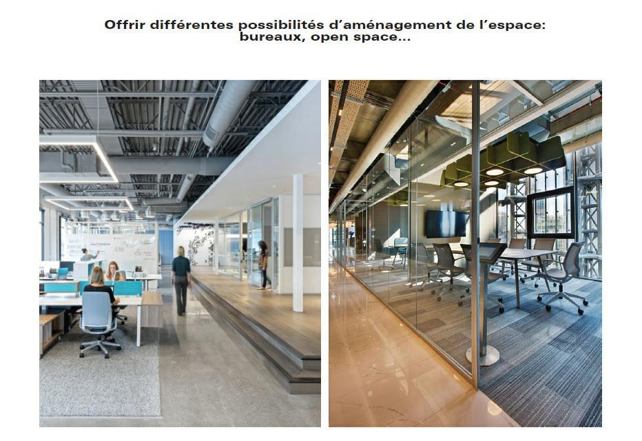 Le cloisonnement des bureaux, des espaces de réunions, des espaces tisaneries, des espaces supports (copie, stockage …), des locaux informatiques sont adaptables selon l’évolution des besoins.