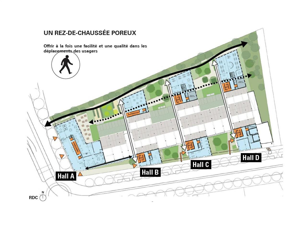 Rez-de-chaussée, largement ventilé. Le bâtiment s’articule autour d’une rue centrale traversant la parcelle d’Ouest en Est, d’où se déploient six ailes asymétriques alignées deux par deux - trois au sud et trois au nord - ainsi qu’un volume en angle à l’ouest.