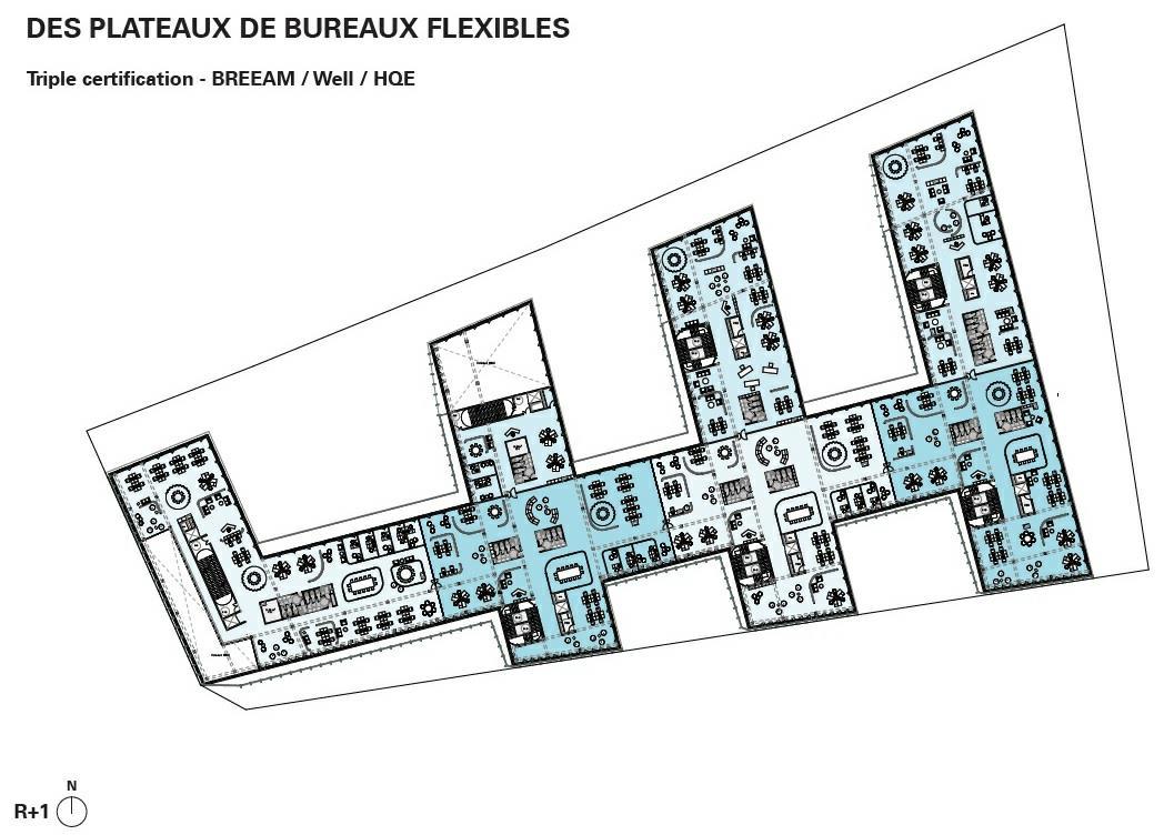 - Rez-de-chaussée : Parking : 153 emplacements pour véhicules et une place livraison, 7 halls communs, 1 RIE, 3 plateaux de bureaux et 3 espaces libres (crèche, fitness et autre).