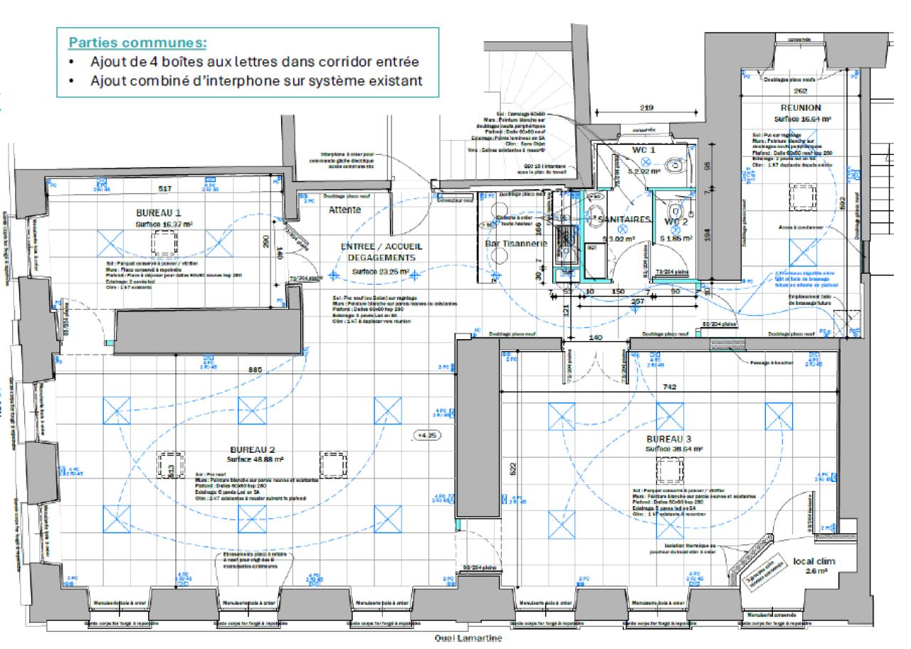 Les bureaux rénovés et climatisés se répartissent de la manière suivante : entrée/Accueil : (23,25 m²), un grand bureaux de direction (16,37 m²), un grand open space (48,88 m²), un multi desks (38,64 m²), une tisanerie et des sanitaires privatifs.