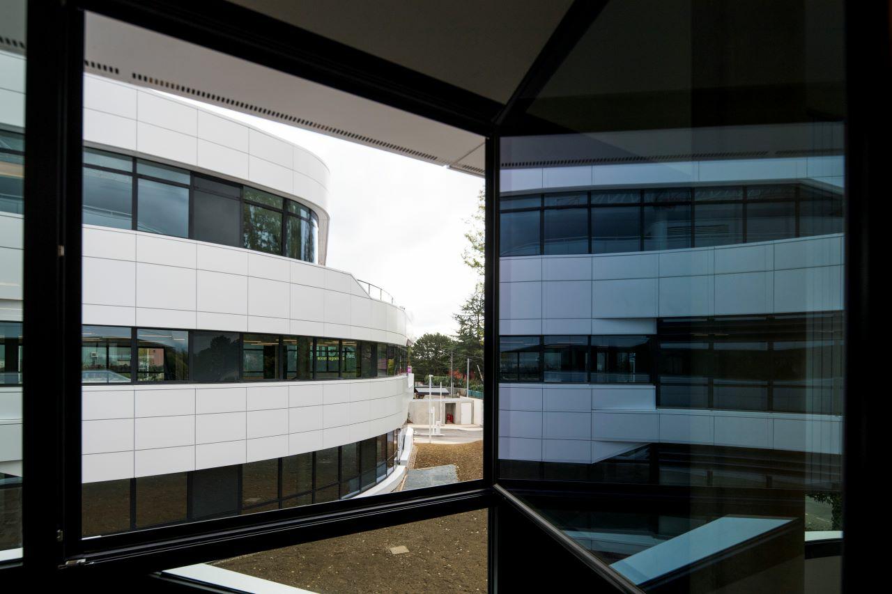 Au cœur de TECHLID, ensemble de 4 immeubles neufs à l'architecture résolument contemporaine dans un ensemble paysager. Courbes et transparences sont les signatures de cette opération emblématique de l'Ouest Lyonnais.