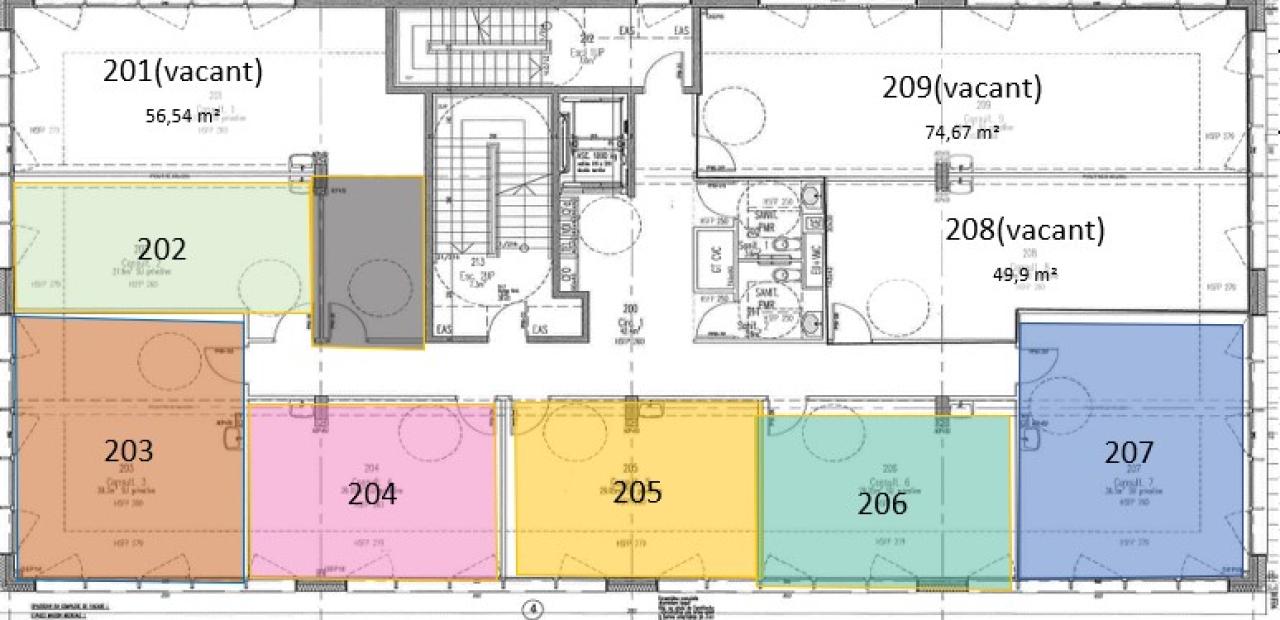 Les bureaux offrent des espaces fonctionnels, lumineux et facilement aménageables selon l'activité exercée. L'organisation des locaux permet une installation rapide et conforme aux exigences des professions de santé.