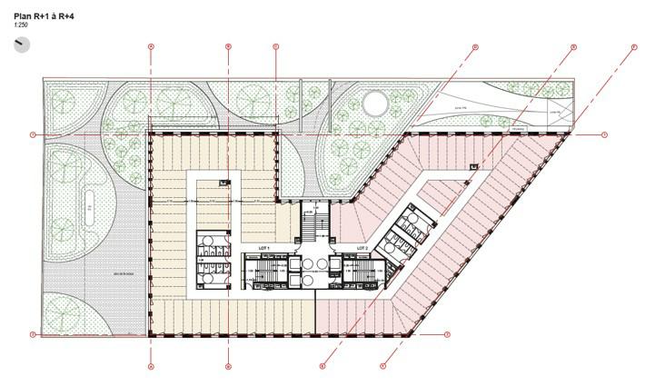 - 5 niveaux de bureaux en superstructure, le R+5 disposant d’une cafétéria (capacité 150 p.) et d’une terrasse en bois couverte de c. 100 m²
