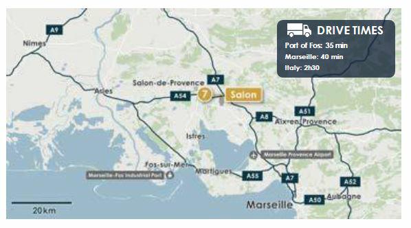 Une localisation stratégique au sein du 3ème marché logistique en France. Salon-de-Provence est une localité clé située à 50 km de Marseille, au coeur de la région Provence-Alpes-Côte d'Azur.
