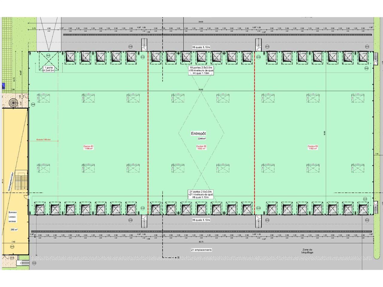 - 19 portes avec 19 niveleurs de quai (Côté Nord) 21 portes avec 21 niveleurs de quai (Côté Sud)
