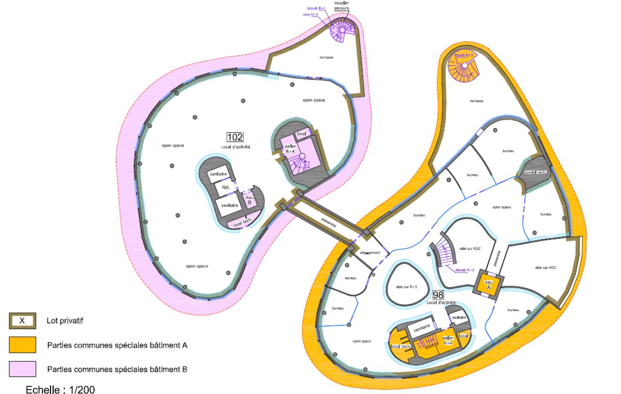 Bâtiment 1A : 1 791,5 m² incluant 98 m² de terrasse, sur 4 niveaux, construit en 2014. Un jardin de 938 m²