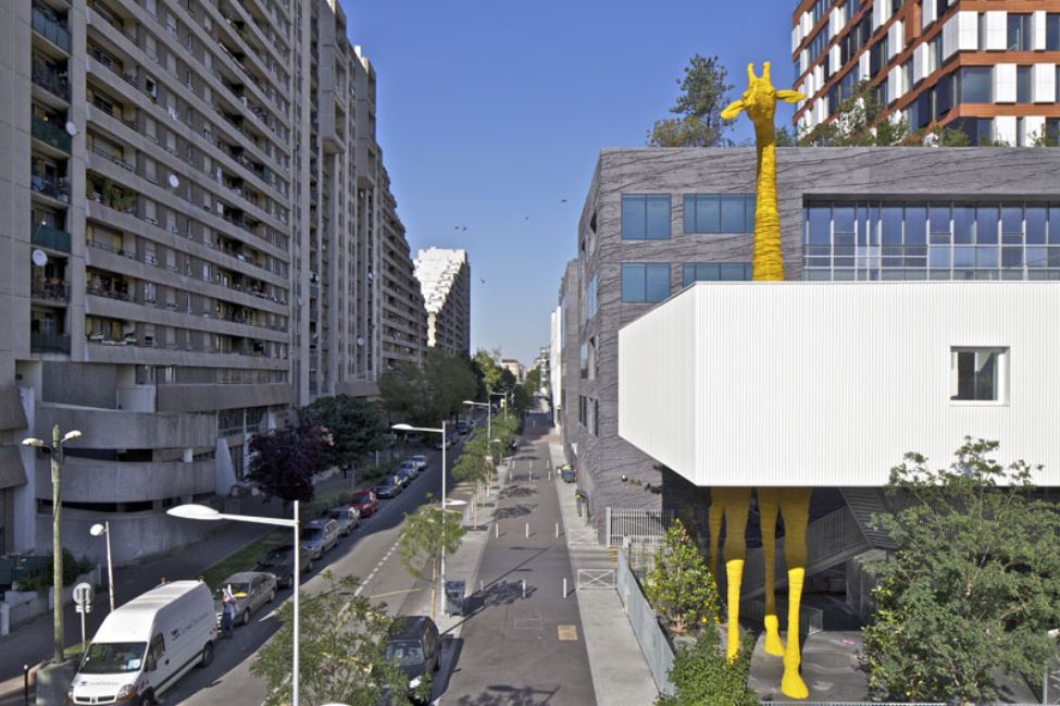 Au pied de la tour Horizons se situe cette crèche de 60 berceaux à objectif « zéro énergie ». L'ensemble du quartier offre un skyline vallonné. Pour s'intégrer dans cette cohérence globale urbaine remarquable, le projet se compose de trois strates étagées, une morphologie qui est à l'articulation de toutes les caractéristiques du quartier : empilement, terrassement et rampe. L'idée est de créer un événement qui anime l'espace public en faisant appel à l'imaginaire enfantin et l'architecture bascule vers la narration. Ainsi, des animaux sauvages investissent les lieux. Une girafe haute de 18 m traverse le bâtiment, pour venir tranquillement brouter la strate arborée à sa portée. La girafe devient l'étendard de l'édifice, visible de tous les points de vue environnants. On passe entre ses jambes pour entrer dans le bâtiment. Plus loin, une oursonne polaire tente de grimper à l'étage supérieur, tandis qu'une famille de coccinelles escalade la façade.