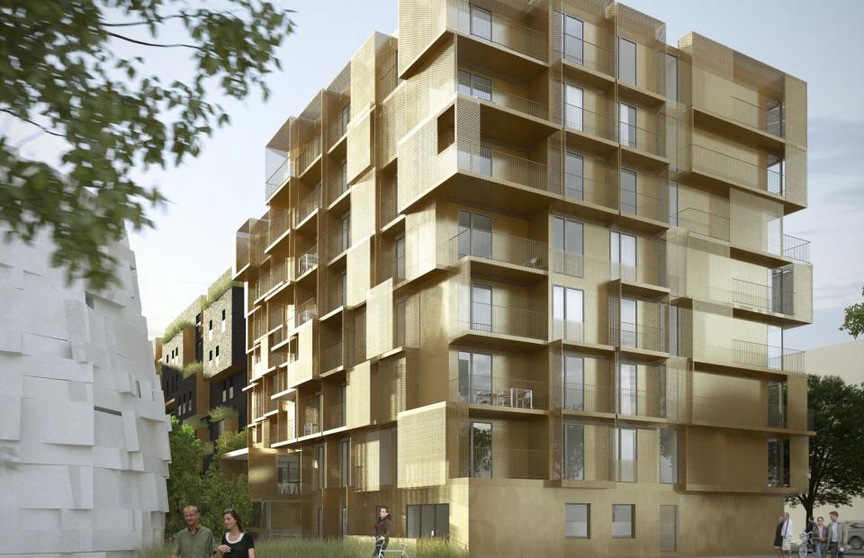Pour cette résidence pour étudiants, une attention particulière a été donnée aux espaces de vie : la salle collective pour les petits déjeuners et tous les logements disposent d'une terrasse individuelle. Un retrait de 1,5 m permet de placer des loggias sur la quasi-totalité de la façade. Les effets de filtre, de moirages ou encore les ouvertures de la tôle métallique perforée estompent les contours du volume. Cette peau est colonisée par des nichoirs, inaccessibles aux locataires et ne nécessitant aucun entretien. La nature est là aussi, une vague verte qui s'étend librement du parvis de l'école en face, sur laquelle la résidence bénéficie de vues charmantes, jusqu'à sa sous-face qui accueille boites aux lettres et vélos dans un prolongement direct de l'espace public.
