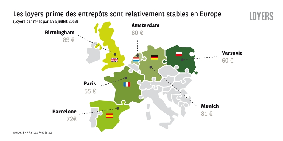 Après un bon début d'année le marché des entrepôts de plus de 5 000 m² a chuté de 6% pour la France, plus particulièrement en région parisienne, et de 26% au Royaume-Uni. En France cette chute s'explique par la pénurie de biens disponibles, les utilisateurs se sont tournés vers des solutions sur mesure notamment dans les régions françaises distantes des grands centres traditionnels. Les loyers prime sont restés stables, allant de 42 € et 48€ en région, et on atteint à 55€ en région parisienne.