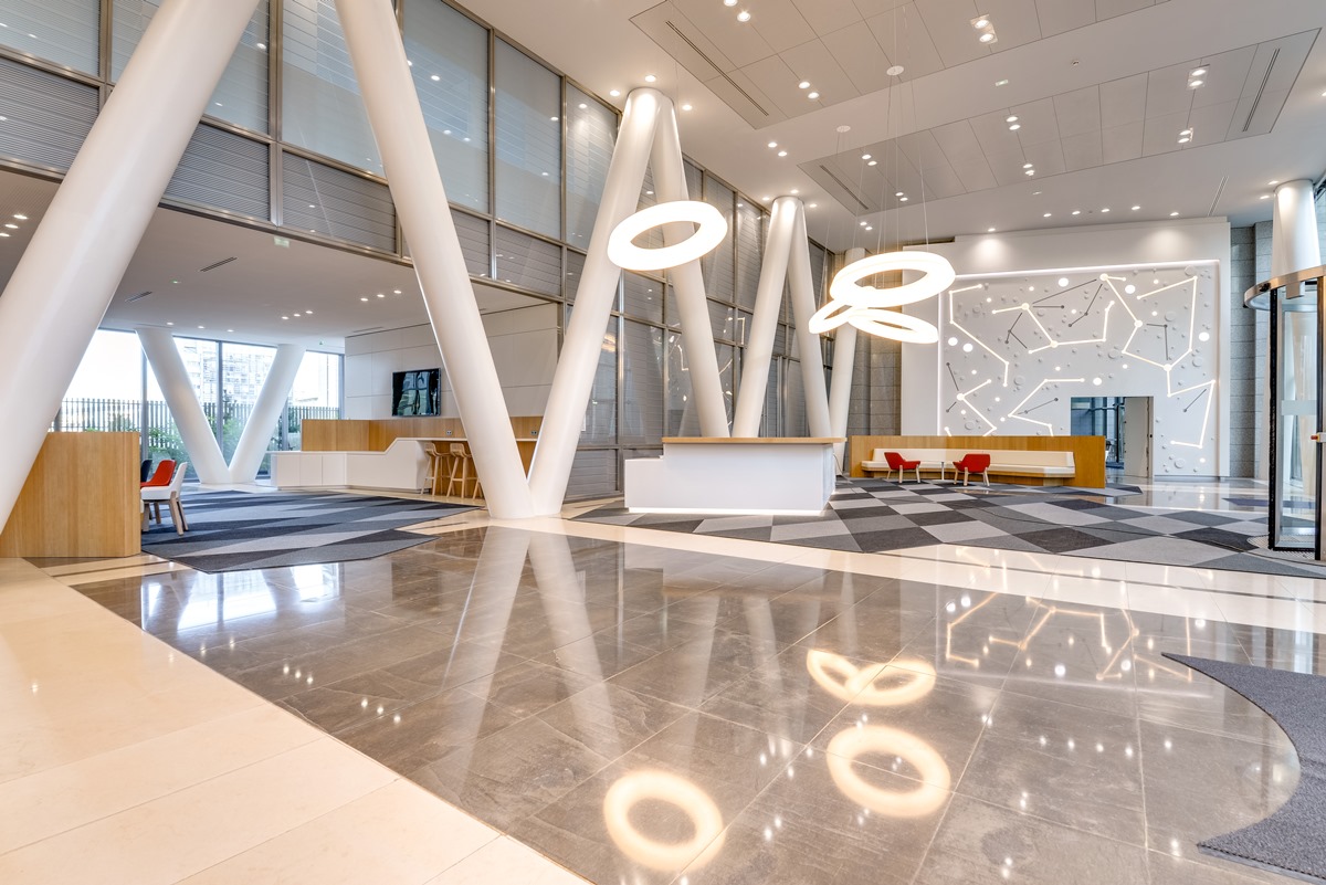 Les espaces intérieurs de l'ensemble tertiaire Palatin ont donc été conçus pour offrir agilité´ et performance aux occupants. Baigné de lumière naturelle pour jouer sur l'équilibre entre ciel, nature et ville, le complexe dessine ainsi de nouveaux lieux de travail épurés, plus ouverts et extrêmement élégants. Le thème de l'invitation au voyage se révèle dès le hall d'accueil grâce à un superbe jeu de lumières qui guide les utilisateurs jusque dans les espaces de restauration avec une scénographie directement inspirée de l'Orient-Express. Construit autour d'un grand panneau lumineux, ce nouvel espace fait également la part belle à la collaboration grâce à des positions de travail accessibles en coworking et situées en rez-de-chaussée (côté Cours du Triangle).
