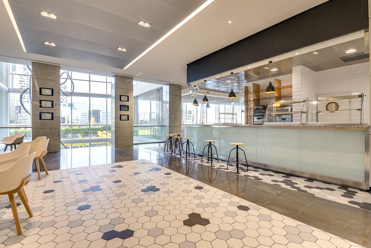 Palatin propose ainsi aux visiteurs et aux collaborateurs plusieurs espaces de restauration. Au RDC, des chaises hautes, des luminaires de style industriel et un grand bar en marbre donnent à la cafétéria des airs de bistrot parisien. Jouxtant cet espace café, le salad bar propose une offre de restauration rapide.
